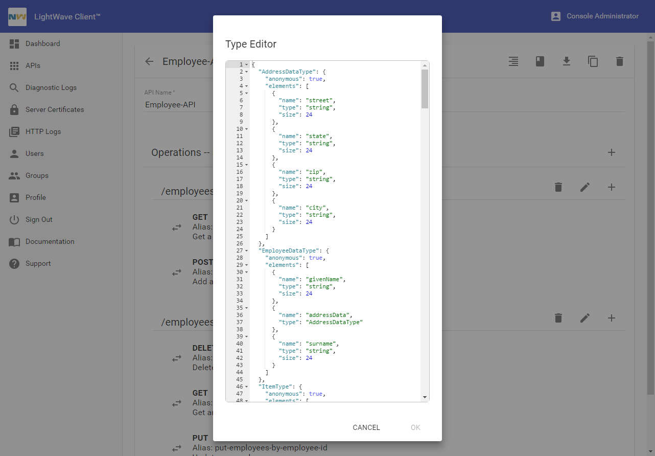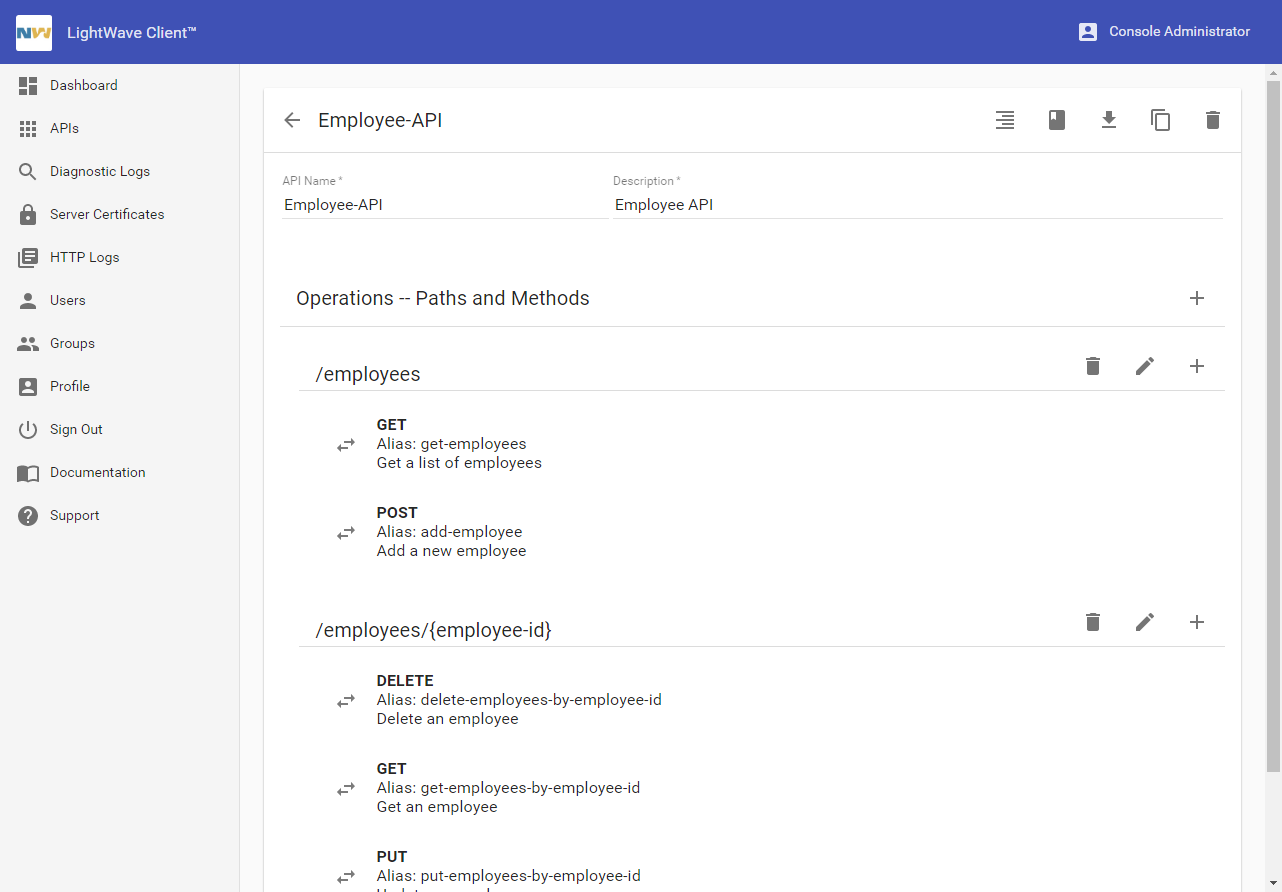 LightWave Client requires an API definition in order to facilitate access from client applications on NonStop servers to remote REST services. You use the LightWave Client Console browser application to create, view and edit API definitions. You can create an API definition by importing a Swagger definition, or using the Console's API Editor together with example requests and responses, either of which may be provided by the service owner. You may also import an API definition previously created and exported from LightWave Client.