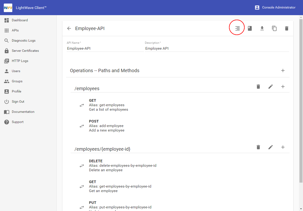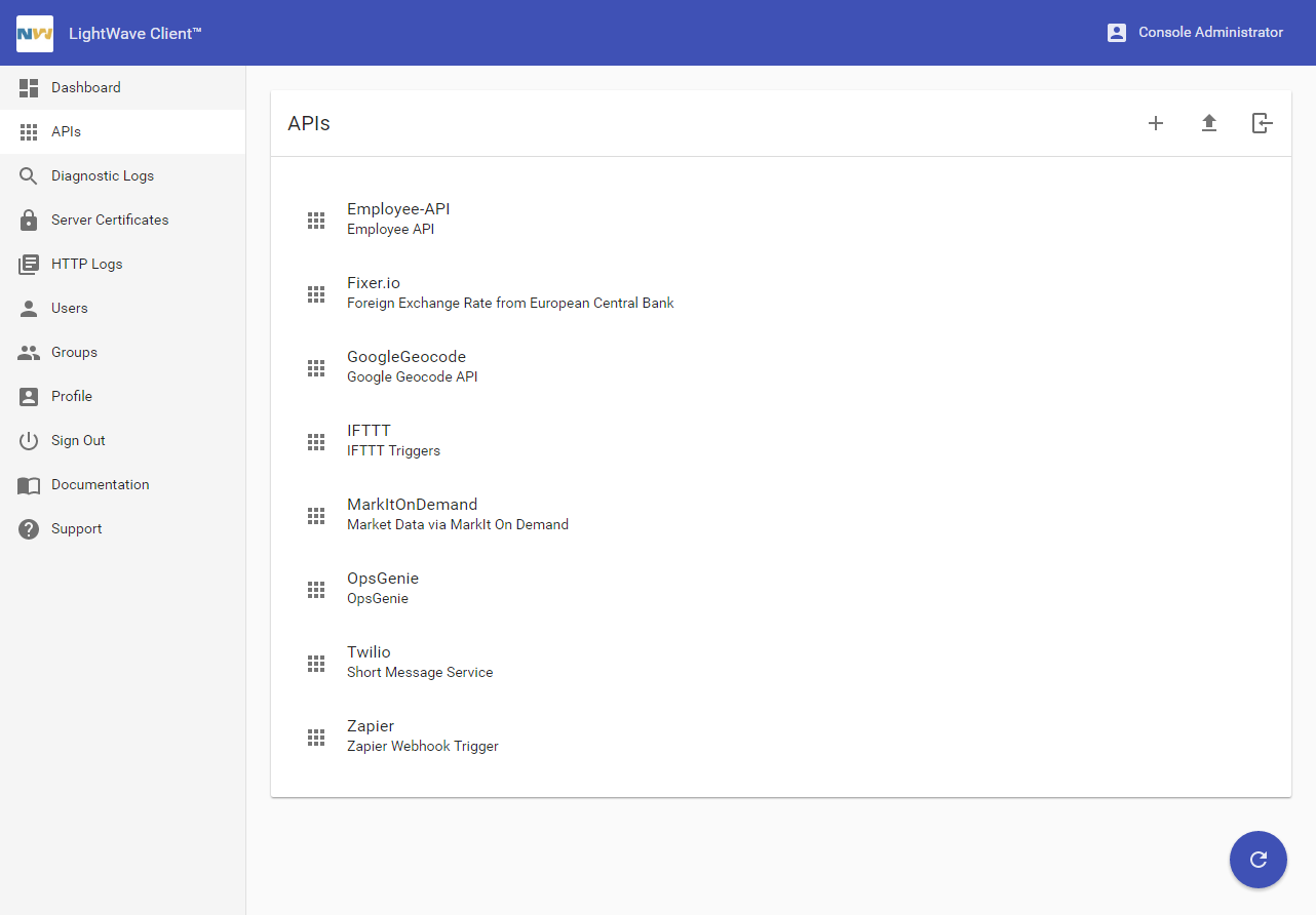 To begin using the LightWave Client Console to work with APIs, sign in to the Console, then use the menu to navigate to APIs. The list of existing APIs is displayed.