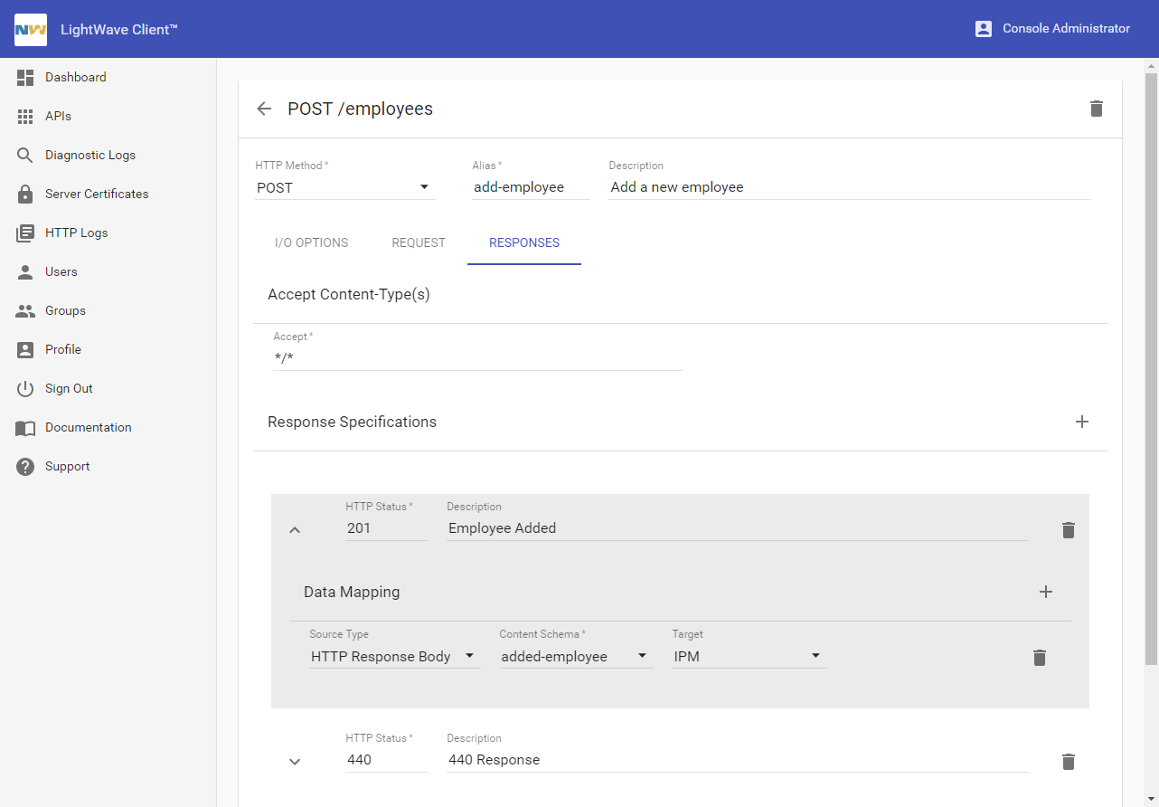 Each request and response definition may include zero or more mappings. The request mappings determine how LightWave Client transforms data received in the client application request IPM into the HTTP request that will be sent to the remote service endpoint. Likewise, response mappings determine how LightWave Client transforms the data in the HTTP response from the service endpoint into the IPM that will be replied to the client application. Since the REST/web API may return differently formatted responses depending on the outcome of the request, each method may include more than one response definition.