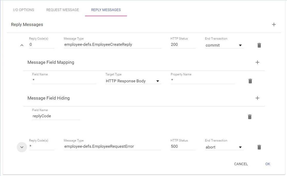 icon found to the left of the Reply Code field to reveal the Message Field Mapping and Message Field Hiding configuration for the reply.