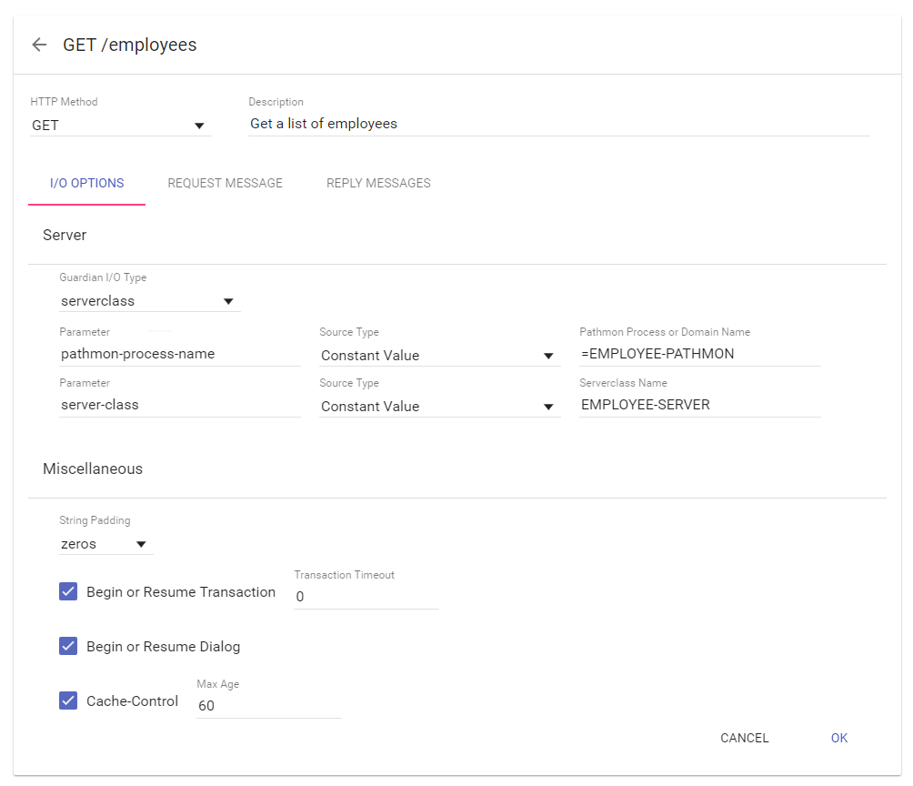 APIs consist of one or more "paths" – the URIs clients will use to call your API. Each path can have one or more "methods", which correspond to the HTTP methods (verbs) GET, POST, PUT and DELETE. Each method defines a server interaction tied to a specific request message and corresponding set of replies. You specify the name of your server, the dictionary definitions that describe the request message (IPM) your server expects and one or more replies it may return. Fields in these messages can be mapped to parts of the URI path, query parameters, HTTP headers or set to specific alphanumeric values.