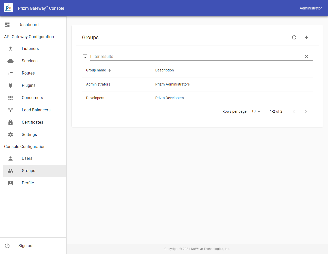 Groups define the permission for access to various Console features. Users are then assigned to Groups and thus assume those permissions. To access the Groups list, select Groups from the Menu.