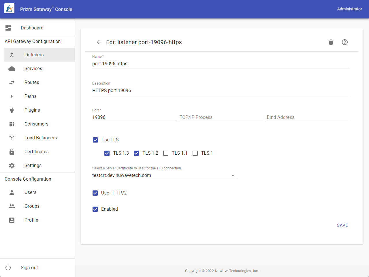 Listeners define which TCP/IP ports the gateway will listen on, and defines the properties of those ports such as whether the port supports TLS and HTTP2, etc. HTTP requests enter the gateway through Listeners. To access the Listeners list, select Listeners from the Menu.