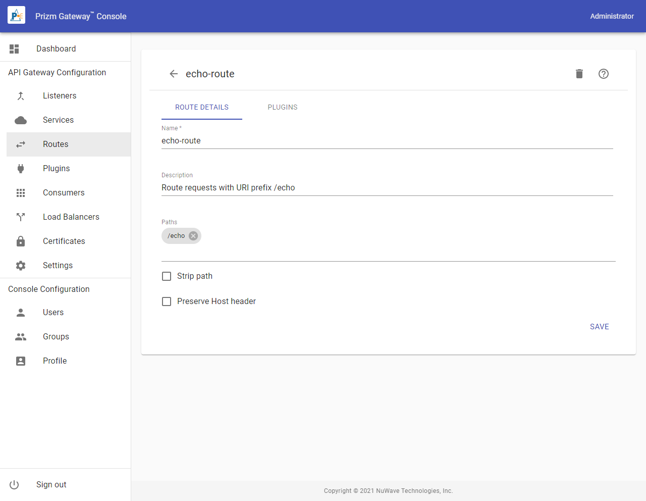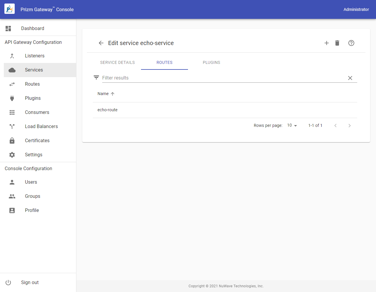 Routes bind Listeners to Services by examining each request entering a Listener and routing it to a Service based on the URI of the request. Routes are defined through Services and are created in the Services Routes tab. To access the Routes list containing all Routes in the gateway, select Routes from the Menu.