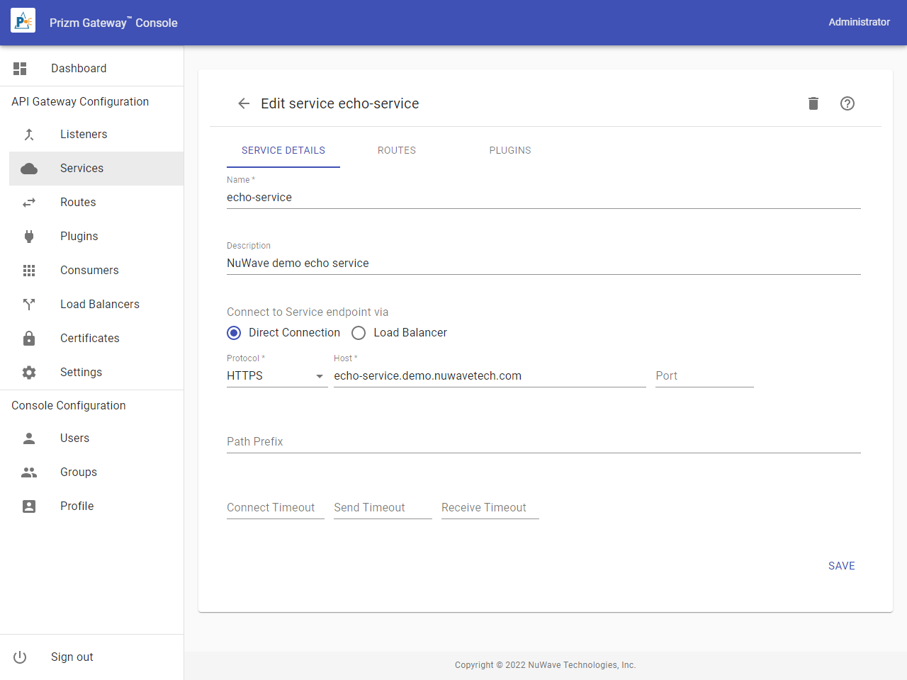 Services define upstream web services service providers. HTTP requests exit the gateway to through Services, either directly, or through a logical Load Balancer. To access the Services list, select Services from the Menu.
