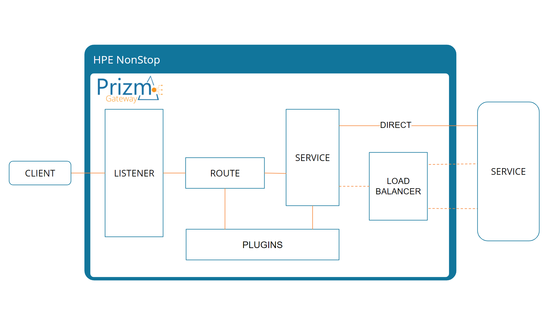 Traffic flows through Prizm Gateway™ via the logical components shown in this diagram. Each component is configured by the Administrator to control Gateway behavior.