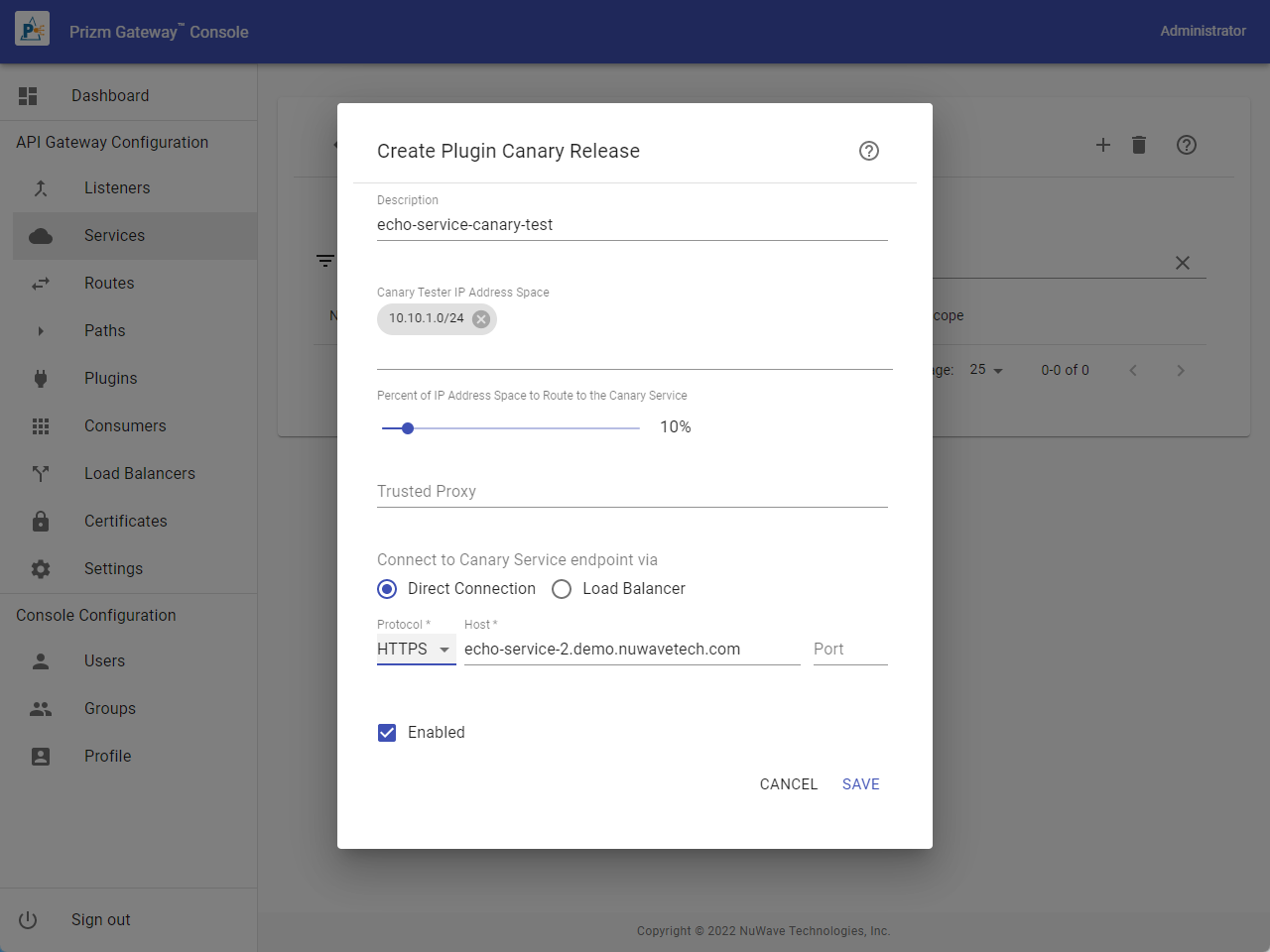| Canary Tester IP Address Space | One or more IP CIDRs describing the test client IP address space. Clients originating from this address space will be selected for routing to the Canary Service endpoint. If no CIDRs are specified, all clients connecting to the gateway will be selected. |