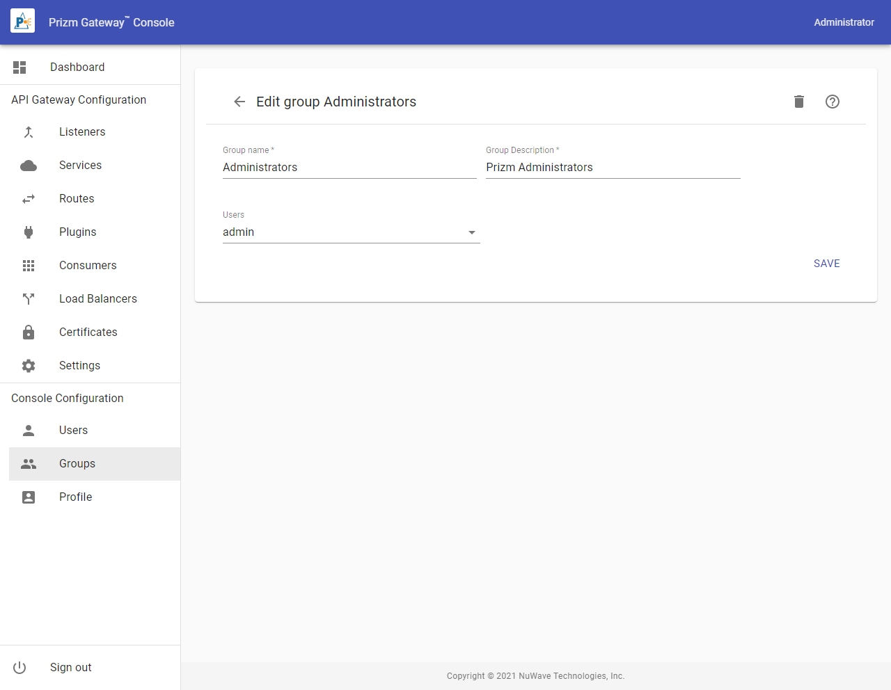 Groups define the permission for access to various Console features. Users are then assigned to Groups and thus assume those permissions. To access the Groups list, select Groups from the Menu.