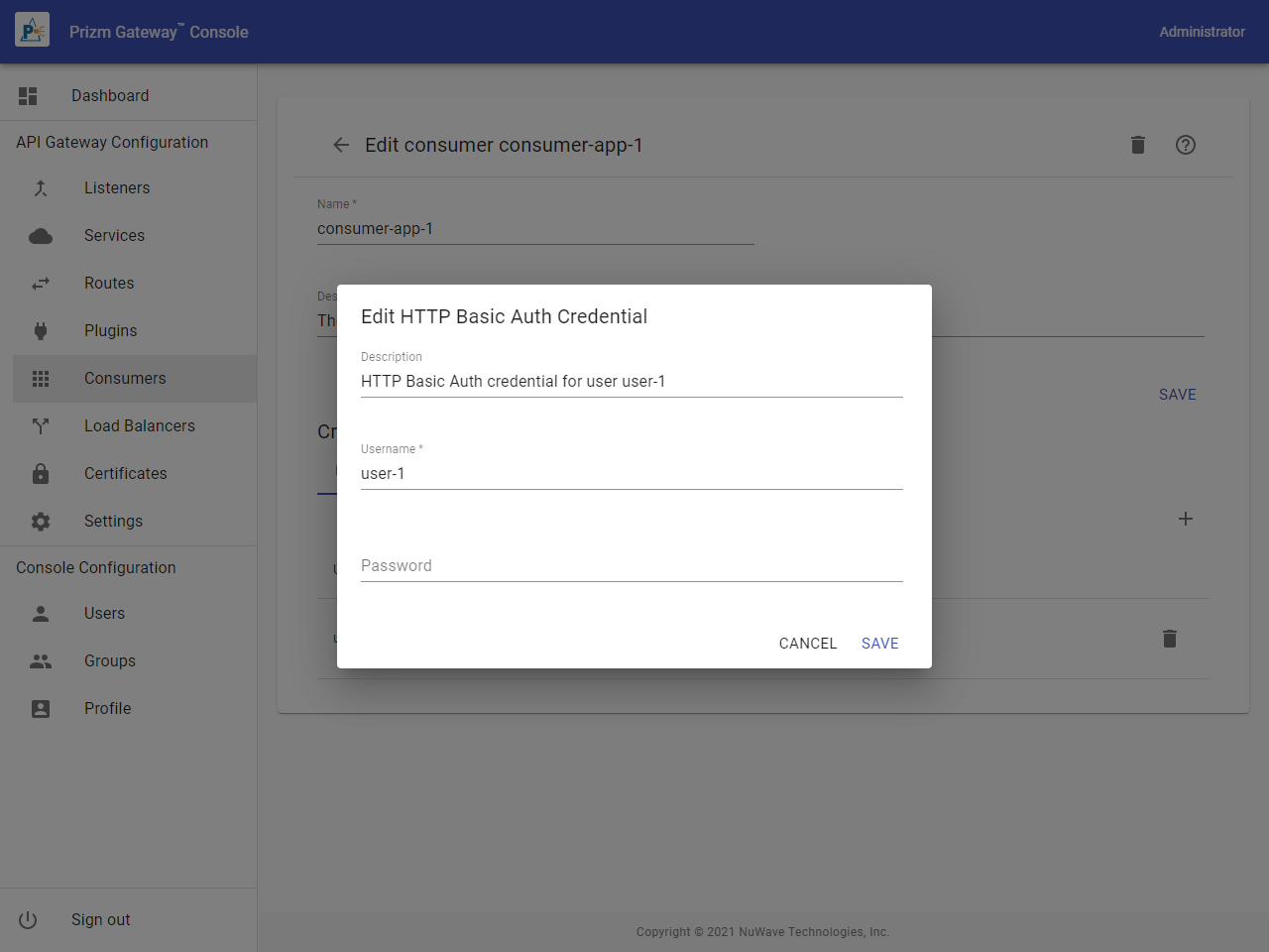 To configure HTTP Basic Authentication credentials for a Consumer, click the Add action icon from the Credentials HTTP BASIC AUTH tab.