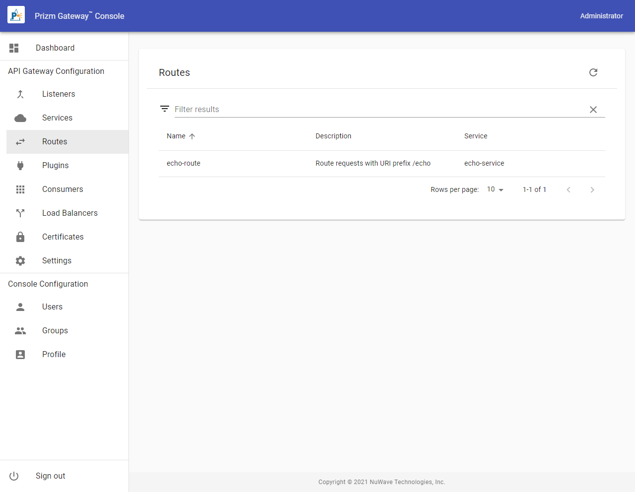 Routes bind Listeners to Services by examining each request entering a Listener and routing it to a Service based on the URI of the request. Routes are defined through Services and are created in the Services Routes tab. To access the Routes list containing all Routes in the gateway, select Routes from the Menu.