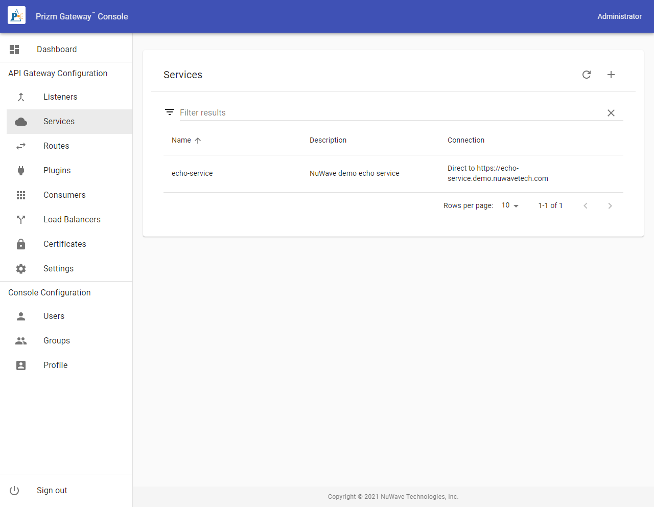 Services define upstream web services service providers. HTTP requests exit the gateway to through Services, either directly, or through a logical Load Balancer. To access the Services list, select Services from the Menu.