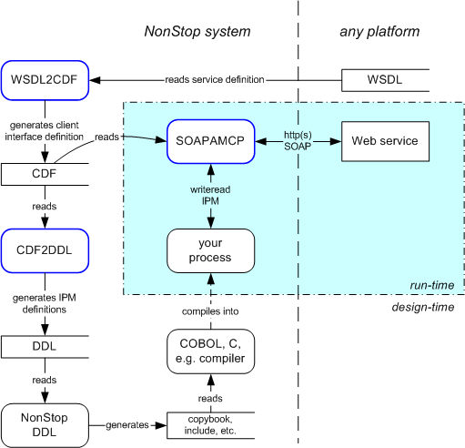 Your NonStop application interfaces with the SOAPAMCP process through the native interprocess message system. The format of the request and response interprocess messages (IPMs) used must correspond precisely to the definitions in the CDF file. The CDF2DDL utility facilitates this by producing NonStop DDL source for the IPMs. You then use the NonStop DDL utility to produce the host language-specific definitions that you compile into your application.