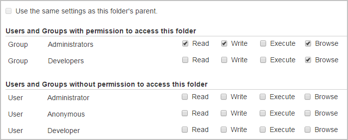 Folder permissions determine which users will be able to read, write, execute or browse the files contained in a given folder. Permissions cannot be set on individual files. By default, a subfolder inherits the permission settings of its parent folder.